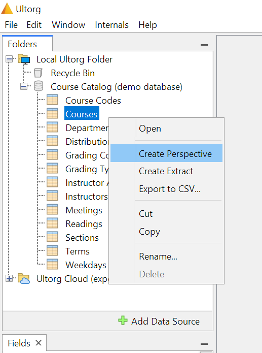To get started, open Ultorg and click “Add Data Source”, then “Connect to Demo Database”. Expand the “Course Catalog (demo database)” icon to see the tables in the database. Right-click a table and click “Create Perspective” to create a new query:
